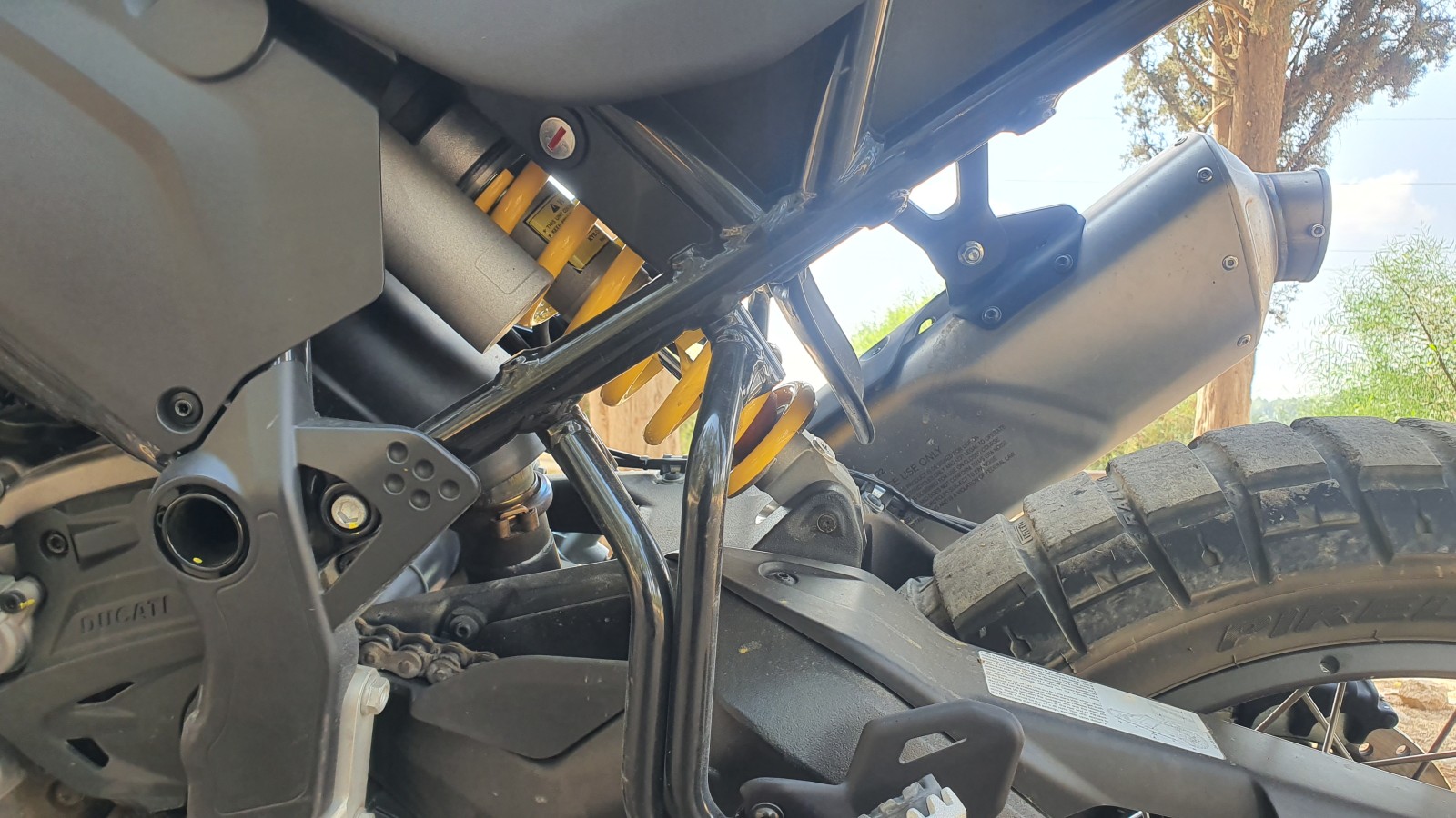 יש מצב שאני סתם מדמיין, אבל בשלב מסוים היה לי חיזיון של אנטוניו ממחלקת החלקים של דוקאטי ניגש ללואיג'י מהרכש ולוחש לו בסוד שהמאזן המסחרי של החברה ייראה טוב יותר אם הם יציידו את האופנוע הזה במיכל דלק מפלדה במקום מפלסטיק. אחרי הכל, נפילות, או סתם שפשופים של ציוד המיגון על המתכת, מתקבלים עם פחות סלחנות על ברזל. אחת הבעיות של התרגיל הזה היא שפינוי חום המנוע ברכיבה איטית פשוט לא מספק, ולא רק שהוא מבשל ישירות את הרגליים, גם המיכל מתחמם ואז אין אפשרות לחבוק אותו עם הירכיים.