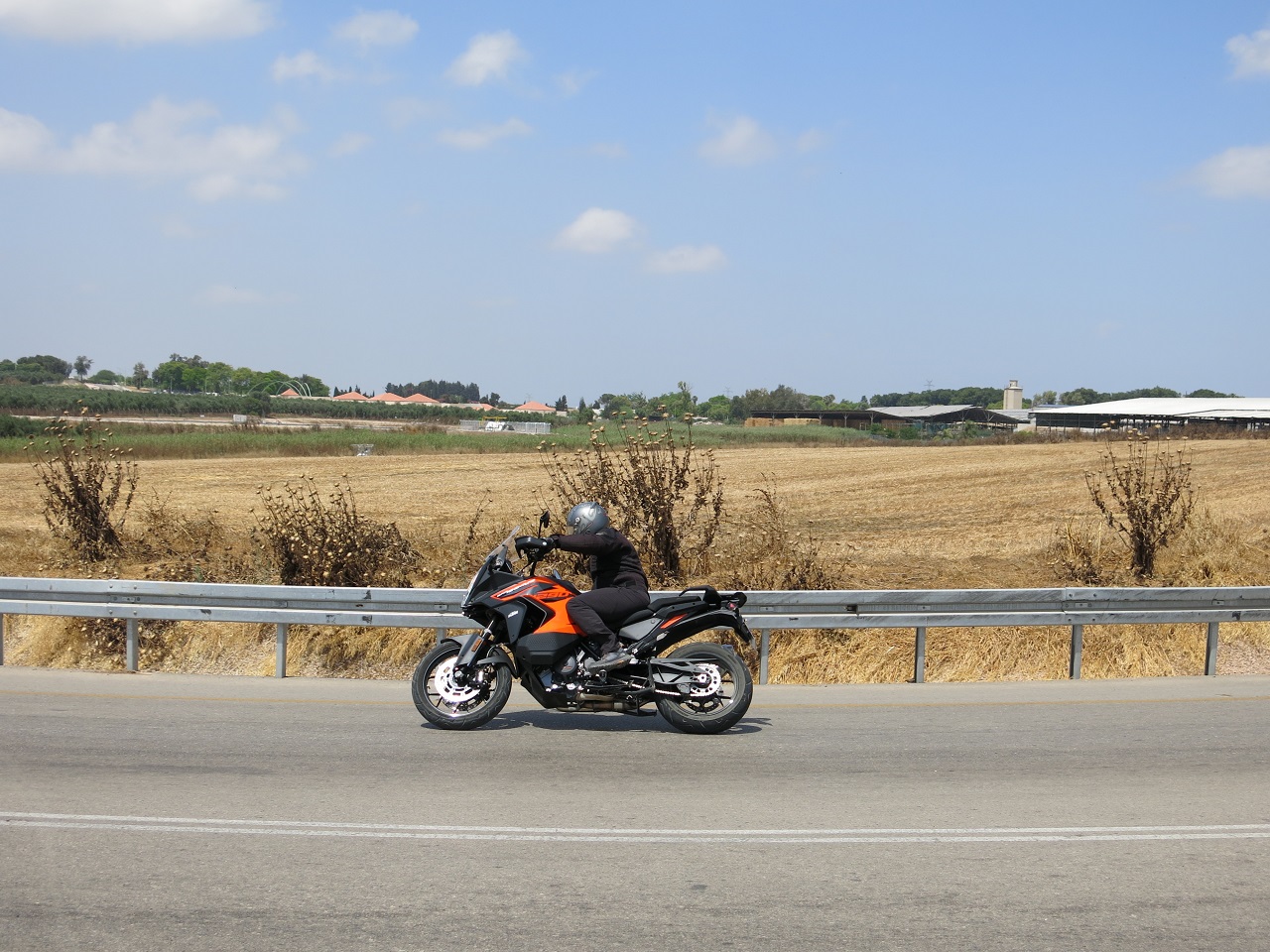 עם הכתום ציירתי בראש קו רכיבה אופטימלי ויצאתי ממנו עם החלקת זנב מבוקרות או עם גלגל קדמי מרחף בהתאם לעומס שהפעלתי על המצערת. הכלי הזה משלב היטב בין יכולות ספורטיביות גבוהות לבין פוטנציאל חוליגניות שמאפיין אופנועי סופרמוטו מקצועיים, והתוצאה היא אופנוע ספורט מודרני. יש לו יכולות דינמיות גבוהות, ועל הכביש הוא יכול להיות הכלי הכי מהיר.