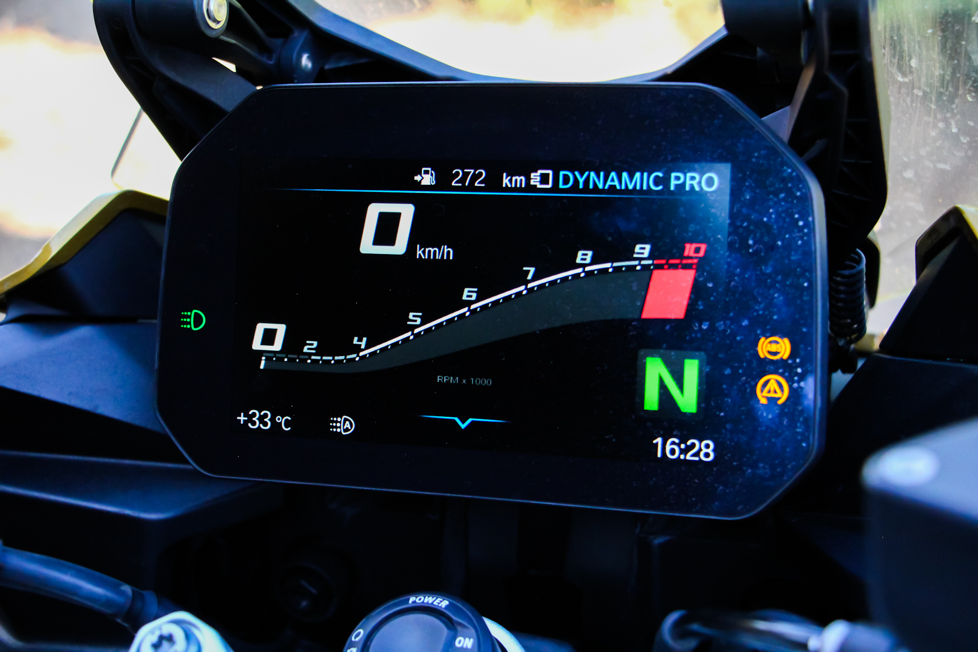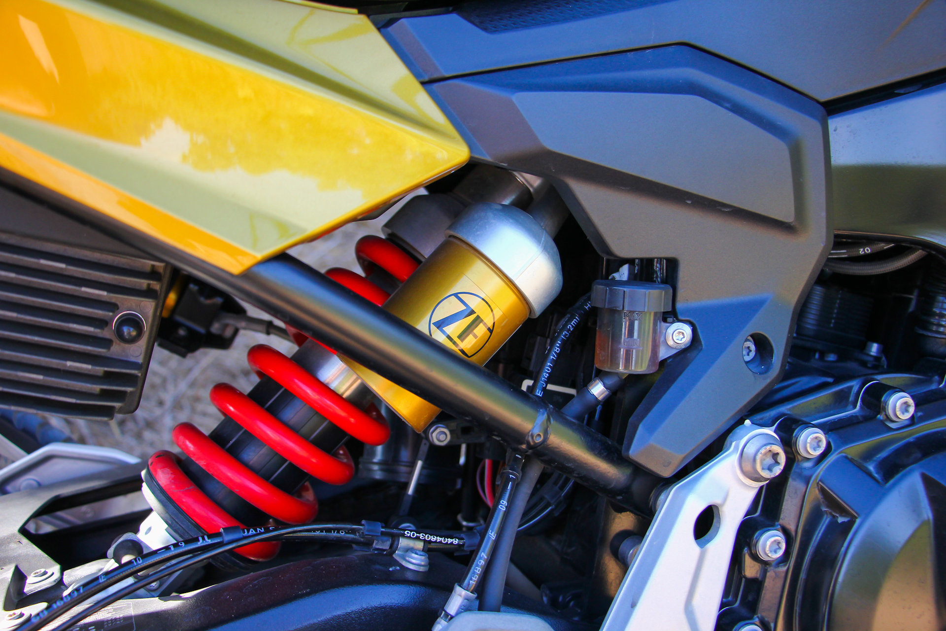 לבולם הזעזועים החצי אקטיבי מאחור יש שני מצבי שיכוך – דינמיק וכביש – ואפשר לבחור ביניהם תוך כדי רכיבה. מצב כביש יוצר מהלך רך בתחילתו, וזה מאפשר שיוט נוח וגובה מחיר בדמות נדנודים של המתלים בעת שינויי כיוון ובהטיות. התוצאה, לטעמי, פוגמת בביטחון של הרוכב. במצב דינמיק, לעומת זאת, מתקבל מתלה קשיח שאמנם פוגם מעט בנוחות אבל יוצר תחושה יותר ספורטיבית ומהודקת. במצב כזה האופנוע יותר יציב ומשדר ביטחון, וההתנהגות מצוינת.