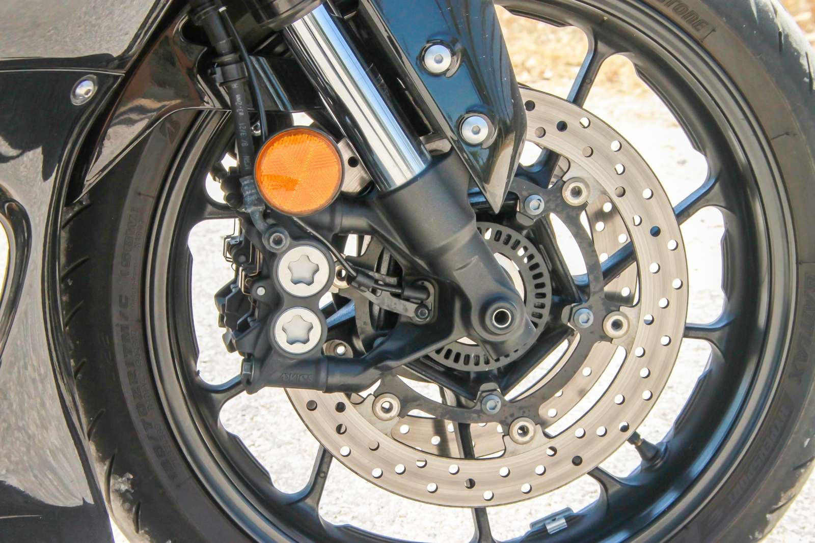 הבלם הקדמי חזק מאוד ויש לו רגש טוב. אפשר לסמוך עליו בסוף ישורת, או אם צצה הפתעה ברכיבה עירונית. הבלם האחורי פחות רלוונטי ובקושי תורם להפחתת מהירות, וה-ABS שלו נכנס לפעולה מאוחר מידי ובאופן איטי.