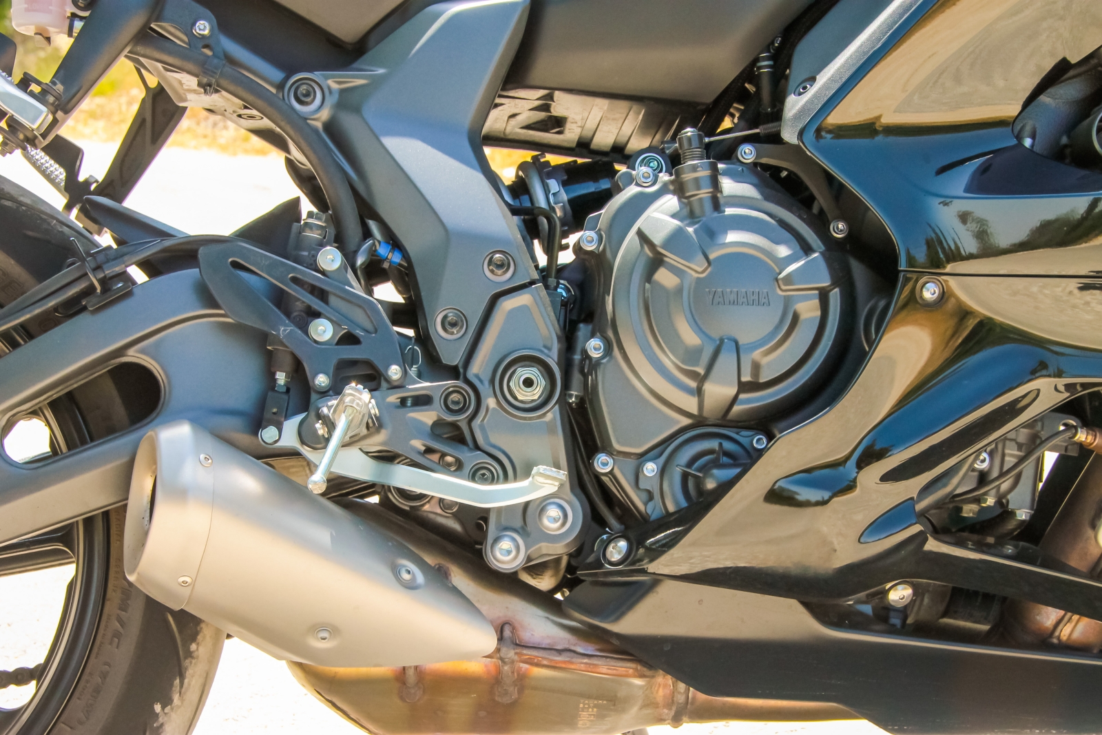 R7 מונע באמצעות מנוע CP2 של ימאהה שמניע גם את MT07, טרייסר 7 ואת 'טנרה' 700. אין לו בקרות או עזרים אלקטרוניים שיכולי לסייע לרוכב (יש רק ABS), אבל אם הרוכב רכש מיומנות מספקת כנראה שאין באלה צורך. המנוע משדר תחושה שמחה, נשלטת וחלקה, והוא צובר מהירות בקצב מספק ולא מאיים. יחסית לאופנוע ספורטיבי מתקבל שיא המומנט די נמוך בקשת הסל"ד (6.8 קג"מ ב-6500 סל"ד), וזה מסייע לו להעניק אופי זריז עם תגובות טובות. אין צורך לסחוט בכוח את המנוע כדי לקבל את מלוא הביצועים.