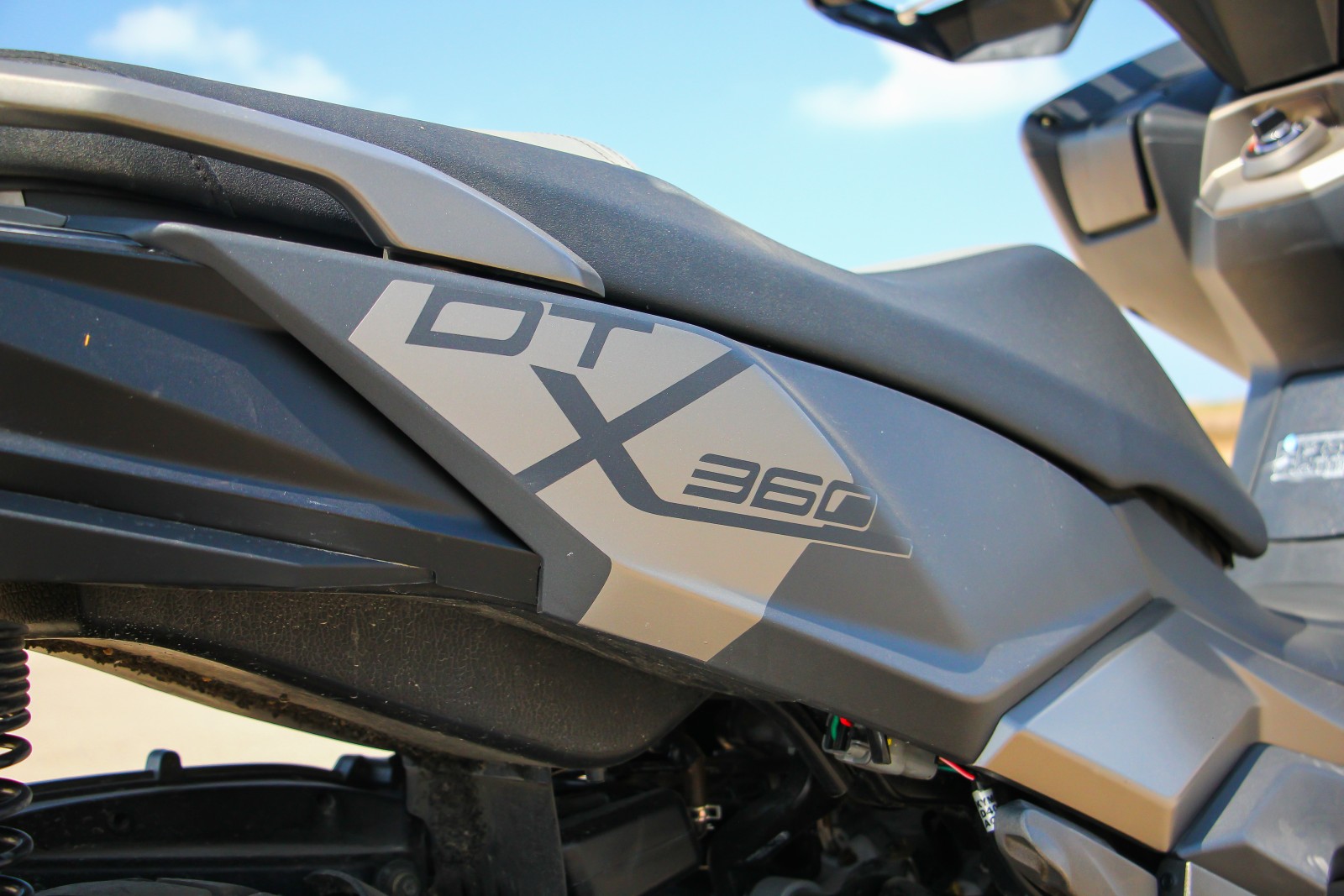 DTX360 אשר נחת בישראל בתחילת הקיץ לוקח את הפלטפורמה המוצלחת של דאונטאון 350 על רוב מכלוליו, ראש וראשון בהם הוא המנוע עם התמסורת ומערכת בקרת המשיכה, ומותיר מספר מאפייני עיצוב מוכרים מן הדגם שממנו הוא צמח. כל השאר כבר נועד לעמוד במטרה שניצבת לנגד העיניים: לפי חוקי הז'אנר יש ל-DTX מעין "מקור" מעל הגלגל הקדמי (במקום כנף שכמעט צמודה אליו), חצאיות פלסטיק קשיחות, משקף גבוה שניתן לכיוון לגובה, וכידון מוגבה עם מגיני ידיים. "פוזה" כבר אמרנו? אז מי אמר שפוזה זה דבר רע?